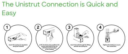 Unistrut connections provide the strength of welding but can easily be taken apart. The Unistrut nut is designed so that normal pressure in installing it causes the nut to bite into and lock itself securely to the channel.